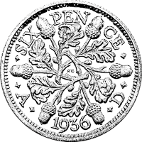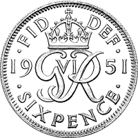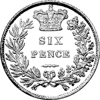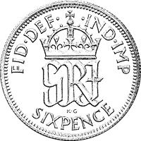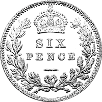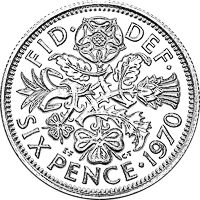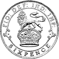 The Sixpence piece of the United Kingdom was one of the most common silver pieces of the realm, minted almost continuously from 1816 to 1967. Originally, the coin was struck in 0.925 fine silver. This was altered in 1920 to 0.500 fine silver, and the composition was changed to cupro-nickel in 1947. Over the years, the silver six pence has been utitlized as a good luck charm for a bride on her wedding day.