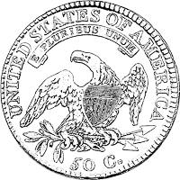 Depending on the denomination, engraved below the perch, the coin’s edge will be either reeded or lettered. In the case of the Half Dollar, particularly those minted from 1807 to early 1836, the edge is lettered with the inscription “FIFTY CENTS OR HALF A DOLLAR.” In this same time period, the denomination was written out as “50 C.” on the coin’s reverse.