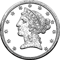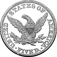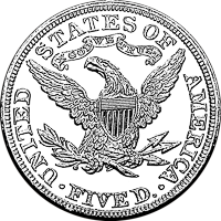 Christian Gobrecht, the artist behind the cherished silver Seated Liberty coinage, was responsible for this long-running design. Similar to previous designs, the profile of Liberty continues facing left and now wears a coronet with her name inscribed. Surrounding her head are thirteen stars to symbolize the original colonies. On the reverse, an eagle spreads its wings and a Union shield covers its chest. The nation’s name encircles the bird and by 1843 the font-size was increased. For the first time in the denomination’s history, its value was spelled out as “FIVE D.”