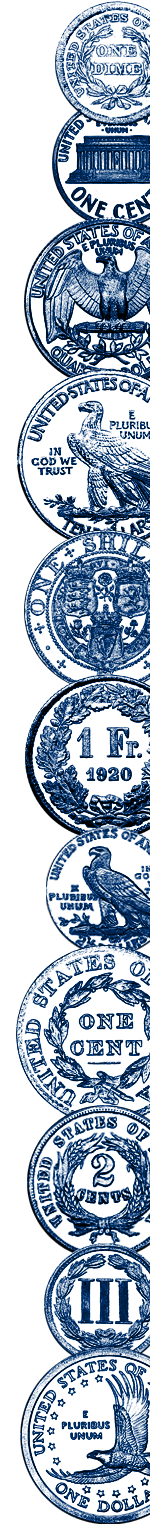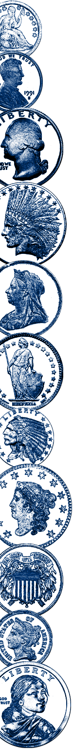 Half Cent (23.5mm) Early Large Cent (29mm) Later Large Cent (27.5mm) Small Cent (19mm) Two Cents (22mm) Nickel Three Cents (17.9mm) Shield Nickel (20.6mm) Nickel Five Cents (21.2mm) Silver Three Cents (14mm) Early Half Dime (16.5mm) Later Half Dime (15.5mm) Early Dime (18.8mm) Early Dime (18.5mm) Later Dime (17.9mm) Twenty Cents (23mm) Early Quarter (27mm) Later Quarter (24.3mm)